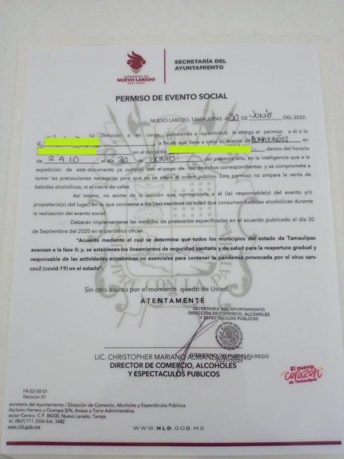 NUEVO LAREDO.-Mientras la anterior administración municipal suspendió el cobro de permisos para realizar festejos, debido a que la gente estaba muy gastada por la pandemia del covid-19, el actual gobierno municipal reanudó el cobro.