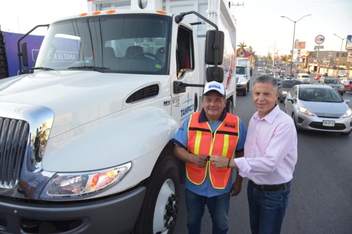 Tampico, Tamaulipas.-Mediante una inversión de 5 millones 800 de pesos, el Presidente municipal Chucho Nader entregó dos modernas unidades recolectoras de basura equipadas con sistema hidráulico para el levantamiento de contenedores.