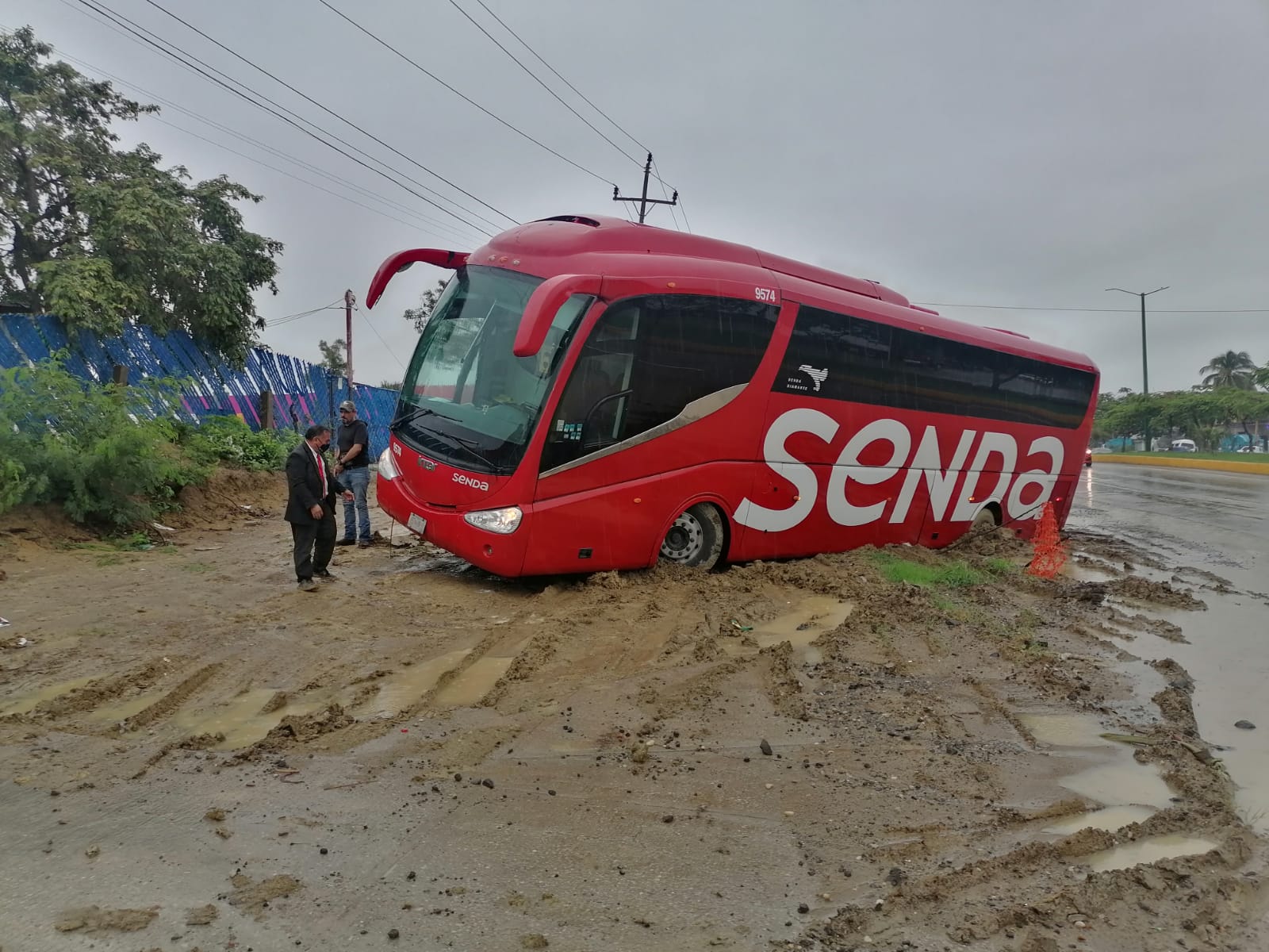 Los hechos ocurrieron después de las 7 de la mañana cuando el chofer del autobús se orilló a una tienda de conveniencia que funciona como una pequeña estación de abordaje, se estacionó sobre el acotamiento y la pesada unidad comenzó a hundirse en el barro.