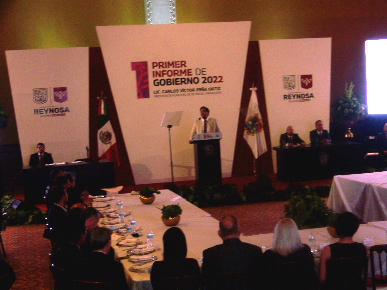 Reynosa, Tamaulipas.-El Presidenta Municipal de Reynosa, Carlos Victor Peña Ortiz, dio a conocer su primer informe de gobierno, donde destacó la realización de importantes obras de infraestructura urbana, apoyos sociales a familias en vulnerabilidad, apoyo al deporte, crecimiento comercial y generación de nuevos empleos entre otros rubros que fueron elogiados quienes acudieron a escuchar del trabajo que ha desarrollado durante casi un año de gestión.