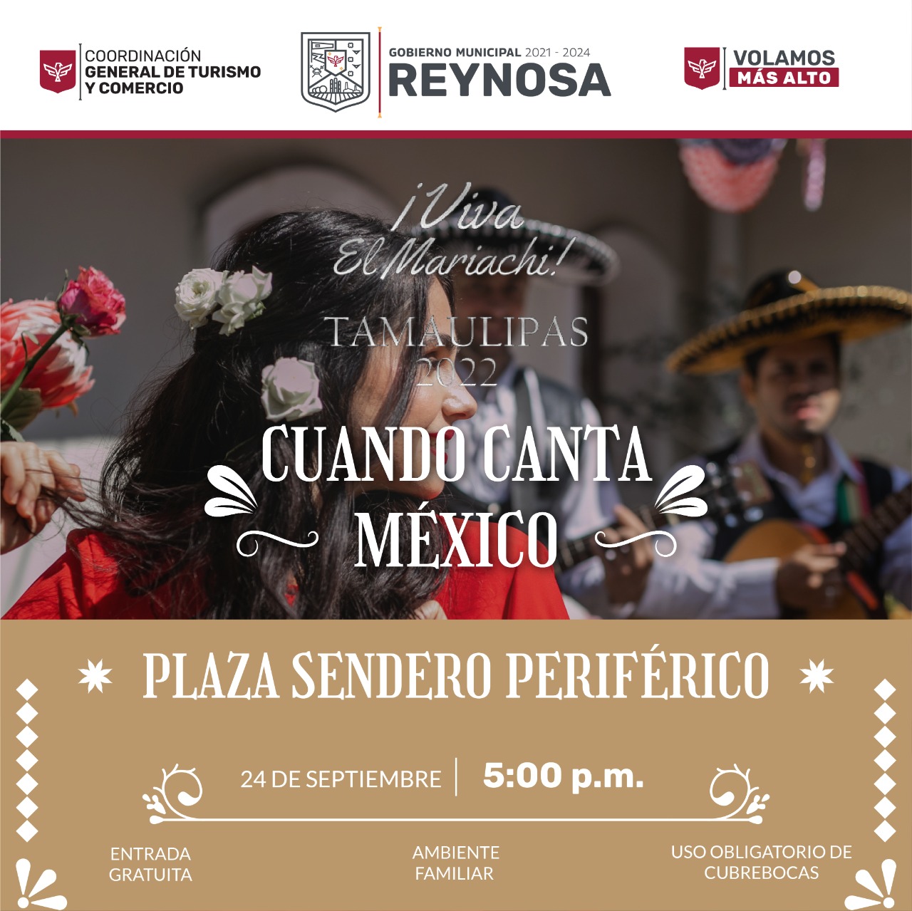 La Coordinación de Turismo y Comercio del Gobierno Municipal, que preside Carlos Peña Ortiz, invita a las familias reynosenses a disfrutar la presentación especial del Festival “Cuando Canta México”, a las 5:00 de la tarde de hoy sábado 24 de septiembre en Plaza Sendero Periférico, con entrada gratuita y uso obligatorio de cubrebocas.