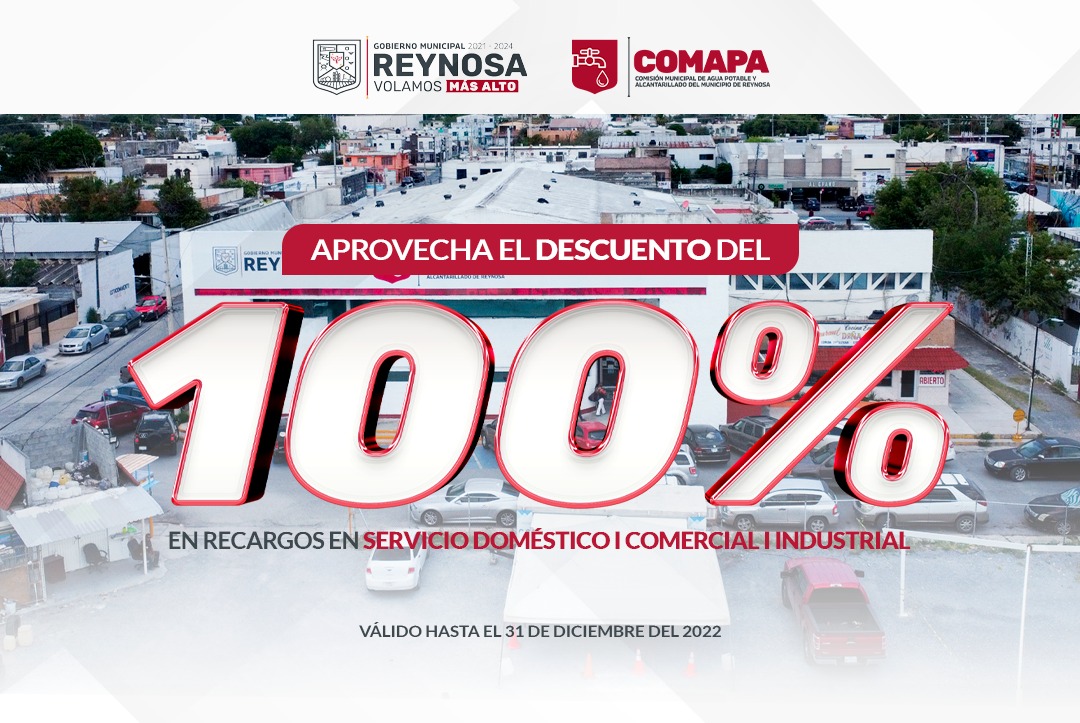 La Comisión Municipal de Agua Potable y Alcantarillado de Reynosa invita a los usuarios a aprovechar la ampliación de descuento del 100% en recargos al pagar su recibo en una sola exhibición, beneficio que estará disponible hasta el próximo 31 de diciembre del 2022.