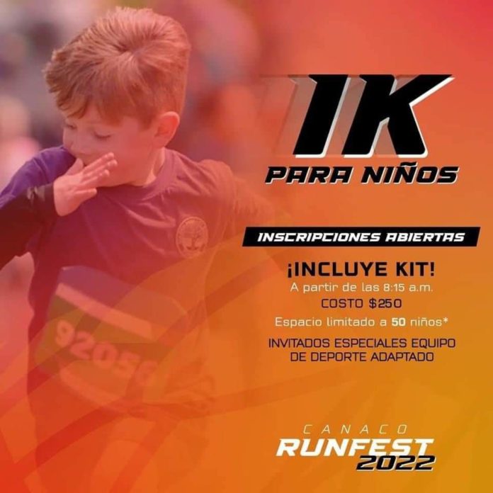El Presidente Municipal, Carlos Peña Ortiz, comparte la convocatoria de la CANACO Runfest 2022, a la que invita a participar el próximo 13 de noviembre en recorridos 5k y 10k para adultos, y una carrera de 1k para niños con cupo limitado para 50 menores, partiendo de la Zona Centro a las 7:00 y a las 8:15 de la mañana.