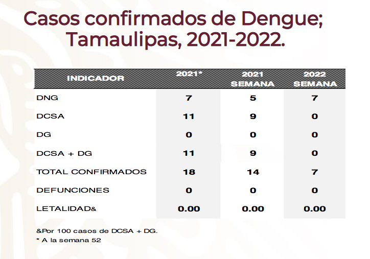 Es de mencionar que Tamaulipas había logrado mantener el control epidemiológico del dengue y por cuarto año consecutivo se encuentra libre de zika y chikungunya.
