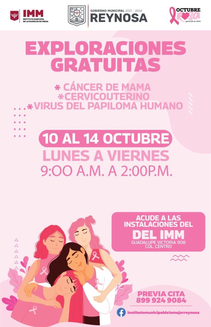 Dentro del marco del mes contra el Cáncer, Octubre Rosa, “Prevenir es Vivir”, el Gobierno de Reynosa, continúa exhortando a la población femenil a través del IMM, a que aprovechen la campaña gratuita de detección oportuna de cáncer de mama y cervicouterino.