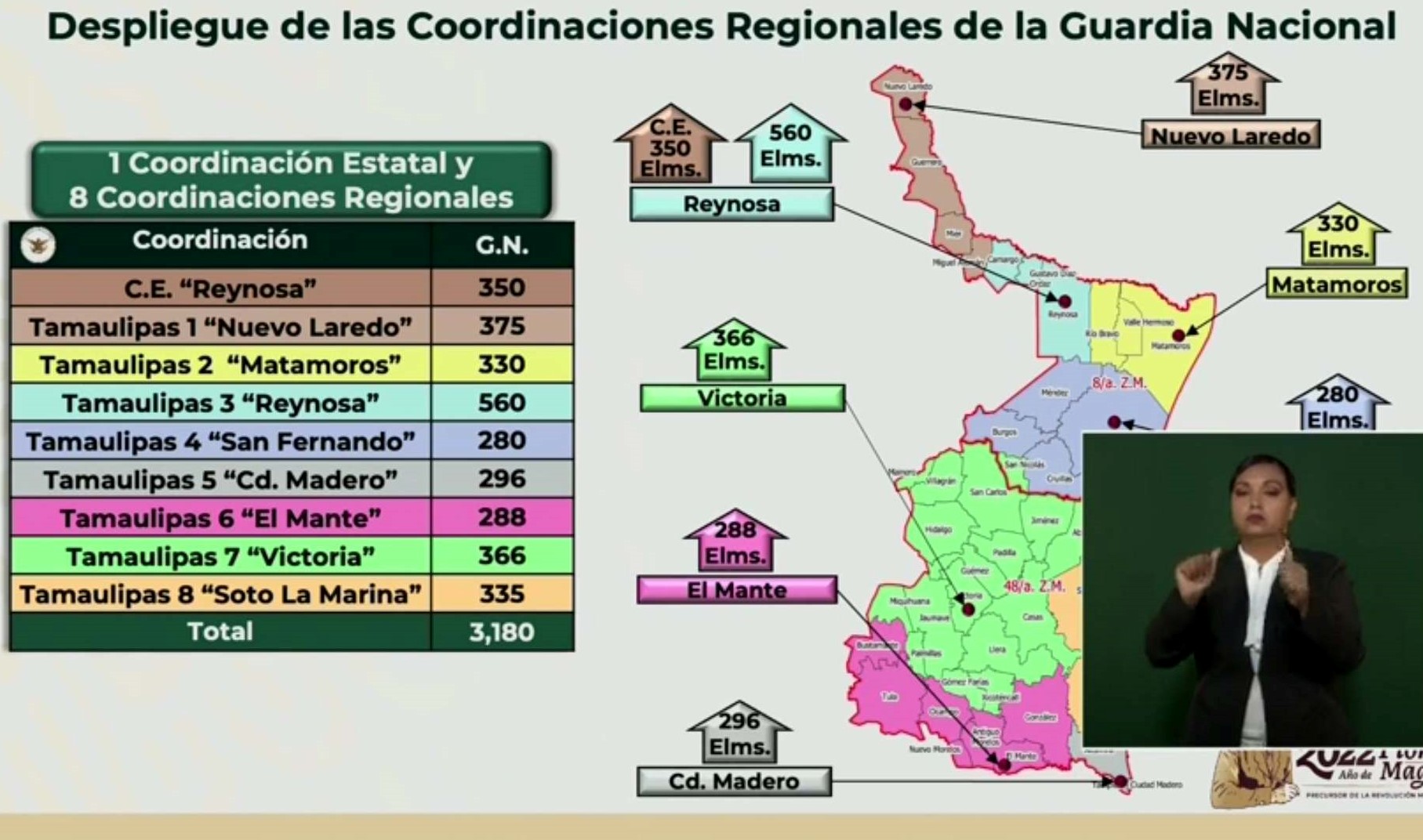 Soto La Marina con 335 y Matamoros con 330, sumando un total de 3 mil 180 elementos de la Guardia Nacional.