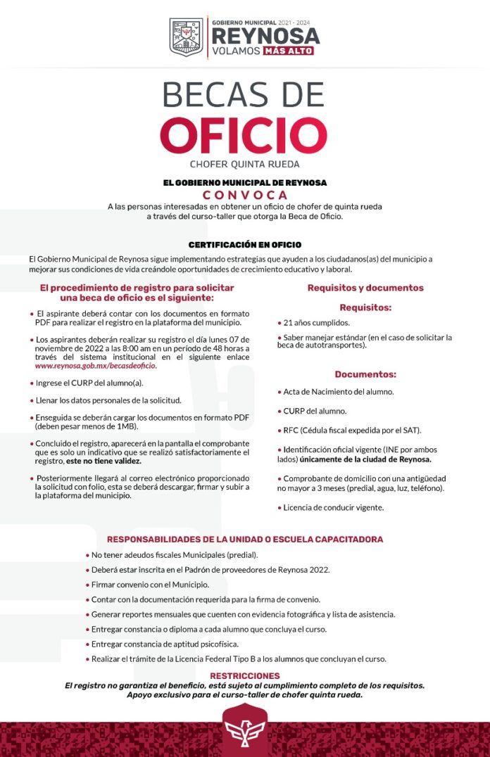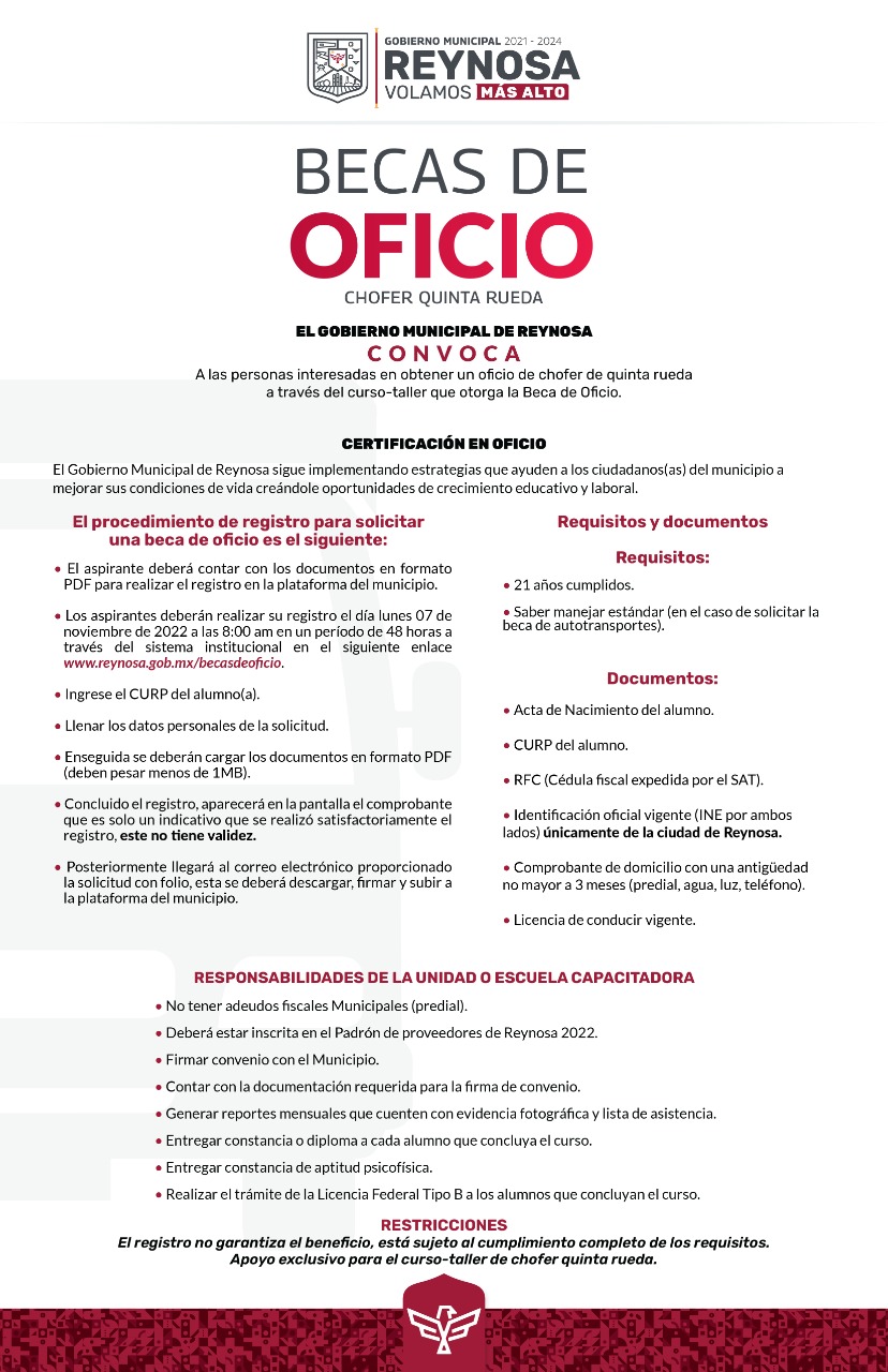 El Presidente Carlos Peña Ortiz, anunció, a través de la Secretaría de Desarrollo Social la apertura de la convocatoria para la inscripción gratuita a los cursos taller para chofer de quinta rueda, mediante la cual los interesados podrán registrarse a partir del próximo lunes 7 de noviembre del 2022, en punto de las 8:00 AM en la página www.reynosa.gob.mx/becasdeoficio