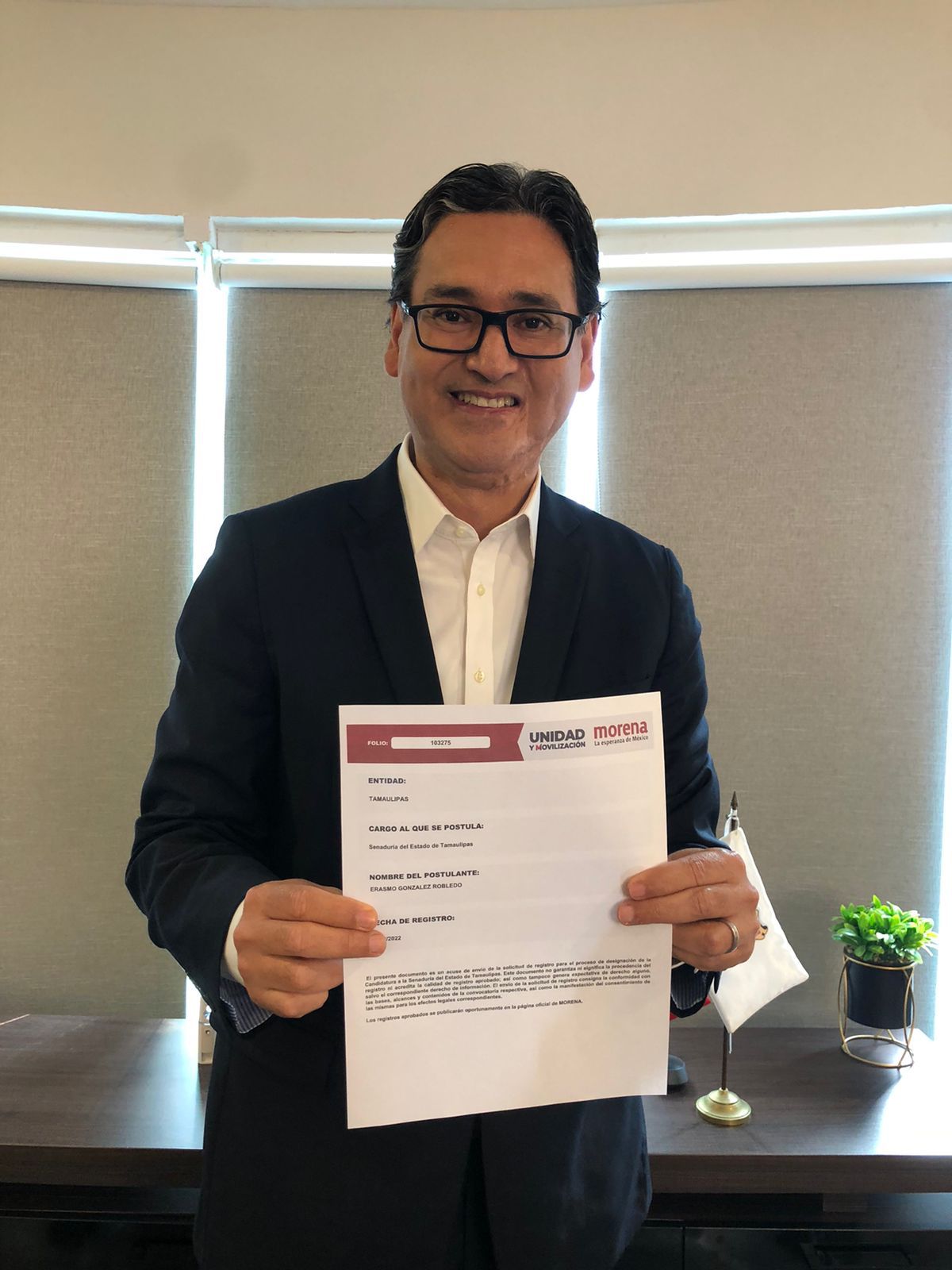 “Estoy muy contento de informarles que realicé mi registro como aspirante a la candidatura para el proceso federal extraordinario de la Senaduría por el Estado de Tamaulipas por nuestro partido MORENA.