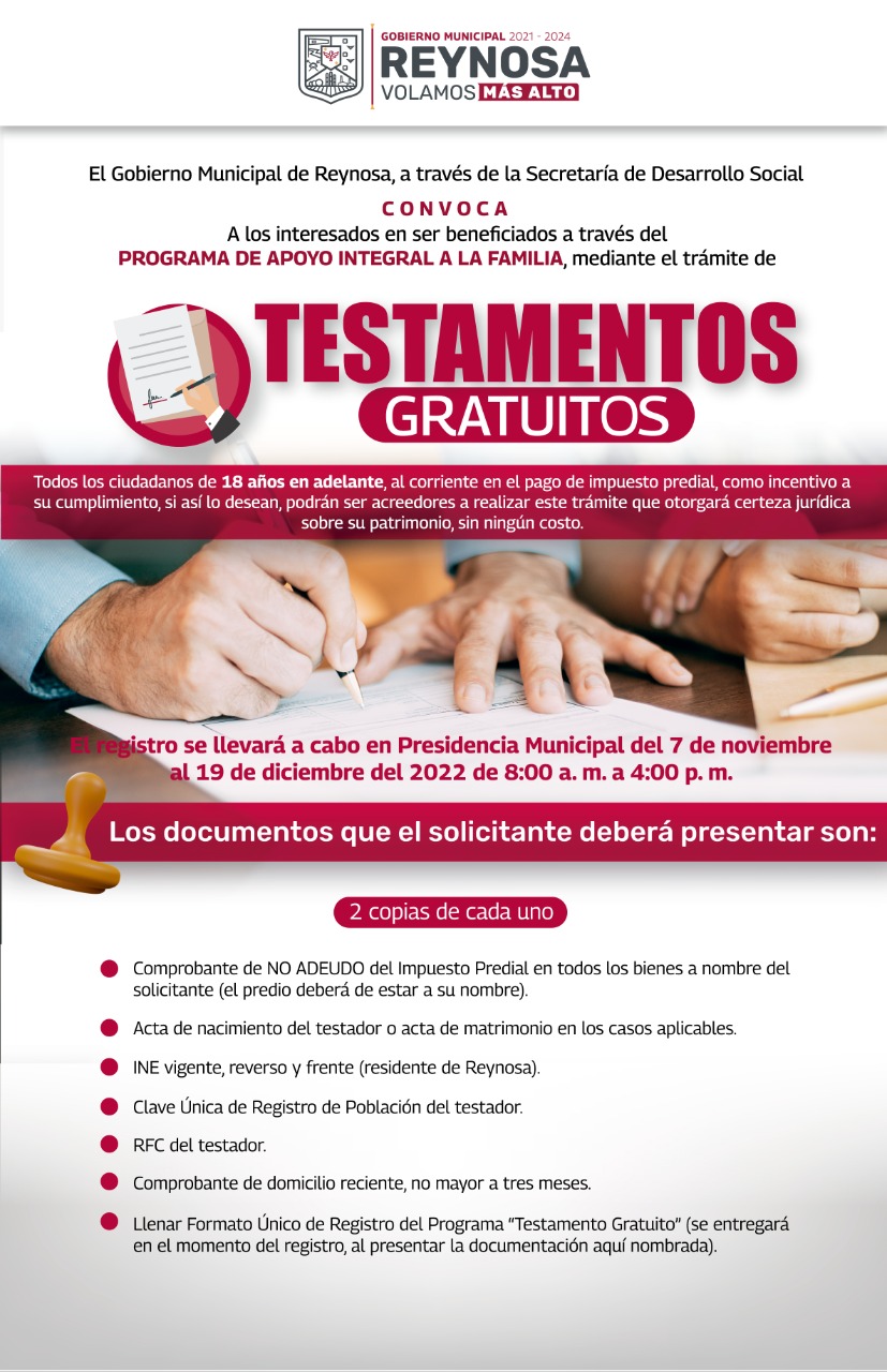 El Alcalde Carlos Peña Ortiz, emitió un recordatorio para las personas que deseen beneficiarse del programa de Testamentos Gratuitos que ofrece el Gobierno Municipal de Reynosa, para personas de 18 años en adelante que tengan al día su cuenta de Predial.