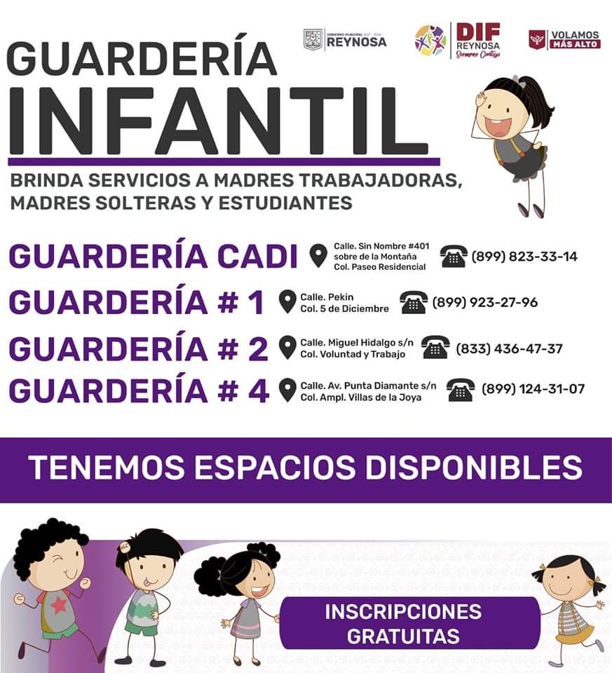 El Sistema DIF Reynosa que encabeza Carlos Luis Peña Garza, en apoyo a los padres de familia, ofrece inscripciones gratis en las guarderías del organismo de asistencia social.