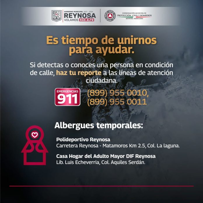 Hoy viernes 23 de diciembre en que la temperatura descendió debajo de los 0° Centígrados se realizará un operativo de ubicación, apoyo y resguardo para gente sin hogar, con la caravana en la que también participarán Tránsito y Vialidad y el DIF-Reynosa con el objetivo de dirigir a las personas vulnerables al albergue temporal del Polideportivo Reynosa.