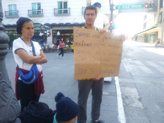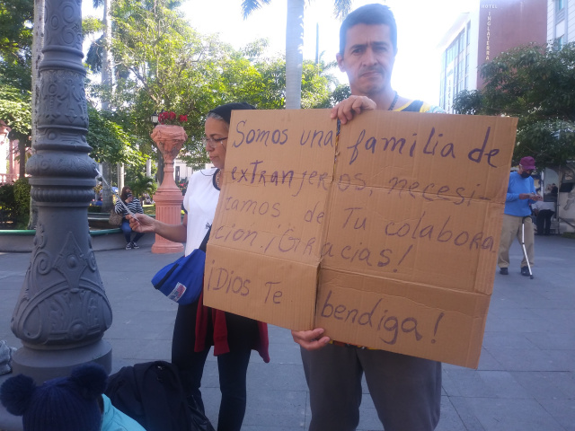 Tampico, Tamaulipas.-Juan Ángel Pavón Guerrero, Joselyn Gregoria de Caires Jiménez y sus dos pequeñas hijas salieron de Venezuela hace 7 meses, ante la crisis económica y de inseguridad que se vive en ese país, el pasado miércoles fueron retenidos por Migración y hasta el pasado lunes, este día se encontraban en la plaza de Armas pidiendo ayuda a la población para comprar sus boletos y poder dirigirse a los Estados Unidos.