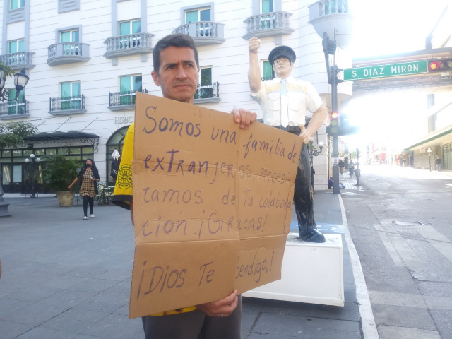 “Ayer vinimos a buscar un refugio para quedarnos y no había espacio, y un señor de los buenos hijos de Dios nos pagó el hospedaje, nos hemos quedado en un hotel, y ahora estamos pidiendo apoyo a los buenos corazones de este hermoso país, de mucha gente que se esta solidarizando con nosotros para reunir el dinero y luego comprar los boletos para continuar la ruta, el destino, que nosotros queremos ir hacia los Estados Unidos, necesitamos para allá 1200 pesos por cada boleto, necesitamos 5 mil pesos para ir a Matamoros, en una empresa de transporte de pasajeros”.