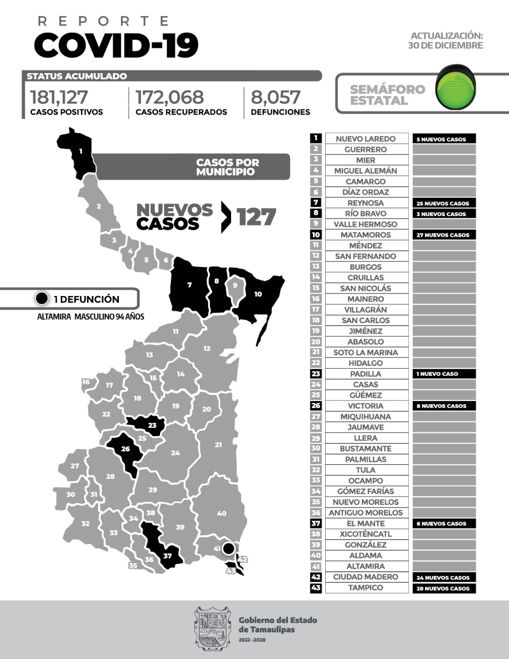 CIUDAD VICTORIA, TAMAULIPAS.- En las últimas semanas epidemiológicas también las enfermedades respiratorias han registrado un incremento en el número de casos, dijo el secretario de Salud, Vicente Joel Hernández Navarro, al señalar que este viernes el reporte oficial de casos de COVID-19 sumaron 127 nuevos pacientes y 1 fallecimiento.