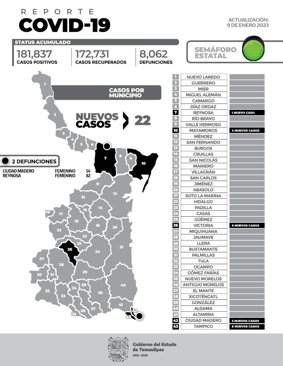 CIUDAD VICTORIA, TAMAULIPAS.-Con el lavado frecuente de manos y el uso del cubrebocas, puedes prevenir cualquier contagio de enfermedad respiratoria además del COVID-19, dijo el secretario de Salud, Vicente Joel Hernández Navarro, al señalar que este día se diagnosticaron 22 nuevos pacientes con esta enfermedad y se reportaron 2 fallecimientos.