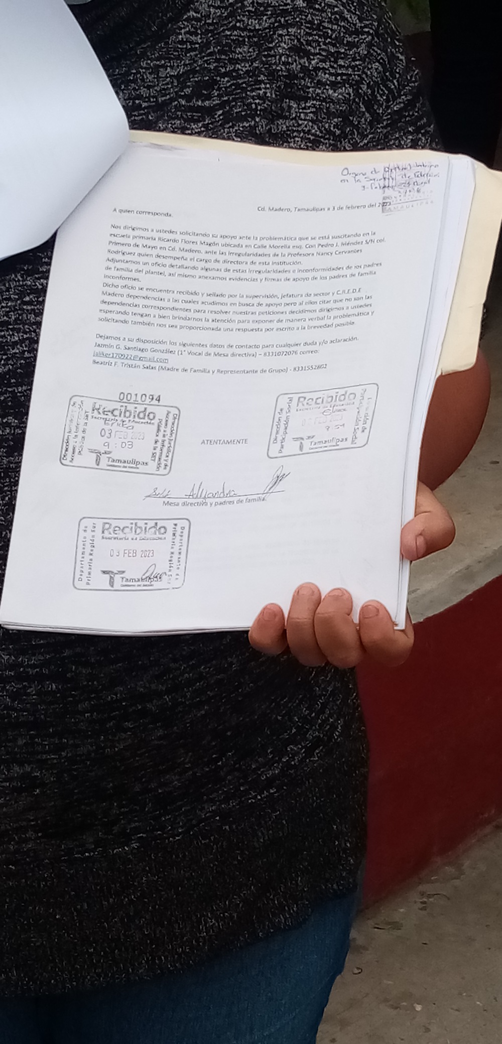Destacó que el jueves acudió una comisión de Ciudad Victoria junto con la directora, pero no para un análisis del problema, sino para tratar de ingresar a la dirección presuntamente a sacar pertenencias, algo que impidieron las madres de familia, pues temen que la responsable de la escuela se pueda llevar alguna información que la comprometa.