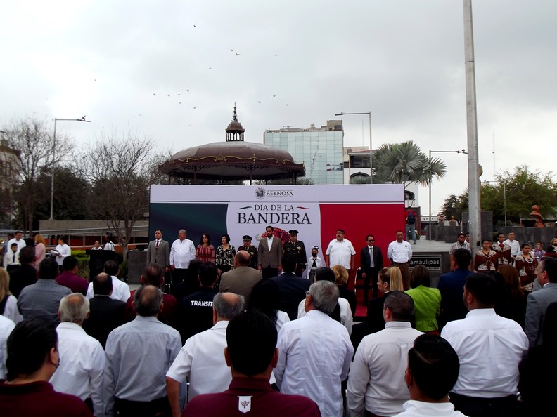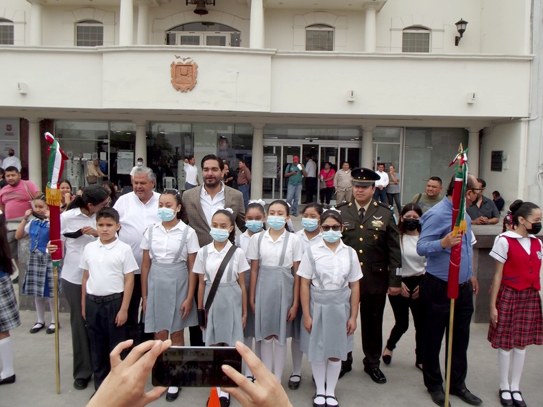 Reynosa, Tamaulipas.-El Presidente Municipal, Carlos Víctor Peña Ortiz, abanderó a decenas de alumnos de escuelas públicas y privadas, además conmemoraron la celebración del día de la bandera.