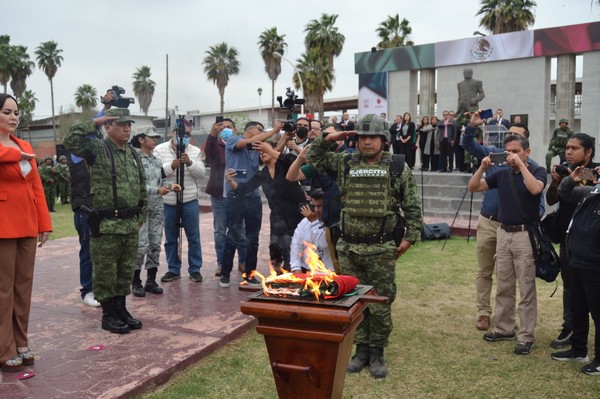 Fue una ceremonia lúcida y llena de colorido y entusiasmo, debido a las diferentes etapas de esta ceremonia que inició con el izamiento hasta la quema de la bandera usada el año anterior, una de tamaño normal de la preparatoria ‘Elena Poniatowska’, que fue depositada en un pebetero con fuego, por la alcaldesa Carmen Lilia Canturosas, custodiada por dos militares que la honraron con un saludo castrense.