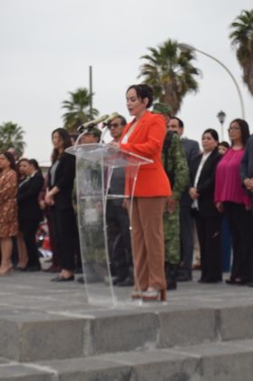 “El Escudo, la Bandera y el Himno Nacional representan la expresión de nuestro patriotismo, la independencia y la soberanía nacional. Nuevo Laredo nos une y refrendamos nuestro compromiso con todos ustedes de continuar gobernado defendiendo siempre nuestros ideales”, fue su discurso de frente ante los estudiantes que la miraban atentos, mientras funcionarios, diplomáticos y militares observaban con respeto el simbólico acto.