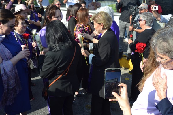Al encontrase las dos delegaciones en la mitad de este puente, se tomaron la mano en son de saludo y de solidaridad, y juntas se tomaron algunas gráficas para mostrar que en esta parte de la frontera común las mujeres de México y de Estados Unidos son solidarias y las une el mismos sentido de correspondencia y de lucha por seguir adelante en la búsqueda de espacios más igualitarios en los ámbitos social, laboral y político.