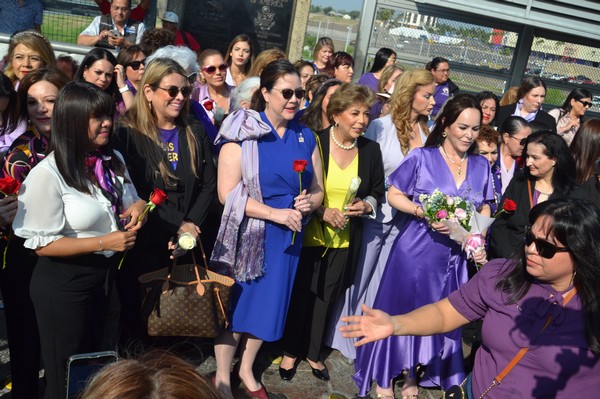 Nuevo Laredo, Tamaulipas.-Cerca de un centenar de mujeres, entre diplomáticas, funcionarias, activistas y periodistas, vistieron prendas moradas para juntas marchar de la plaza Juárez, en el centro de esta ciudad, hasta la mitad del puente internacional ‘Puerta de las Américas’, para encontrarse con una delegación de mujeres de la vecina ciudad de Laredo, Texas, y juntas remembrar la lucha que dio origen al ‘Día Internacional de la Mujer’.