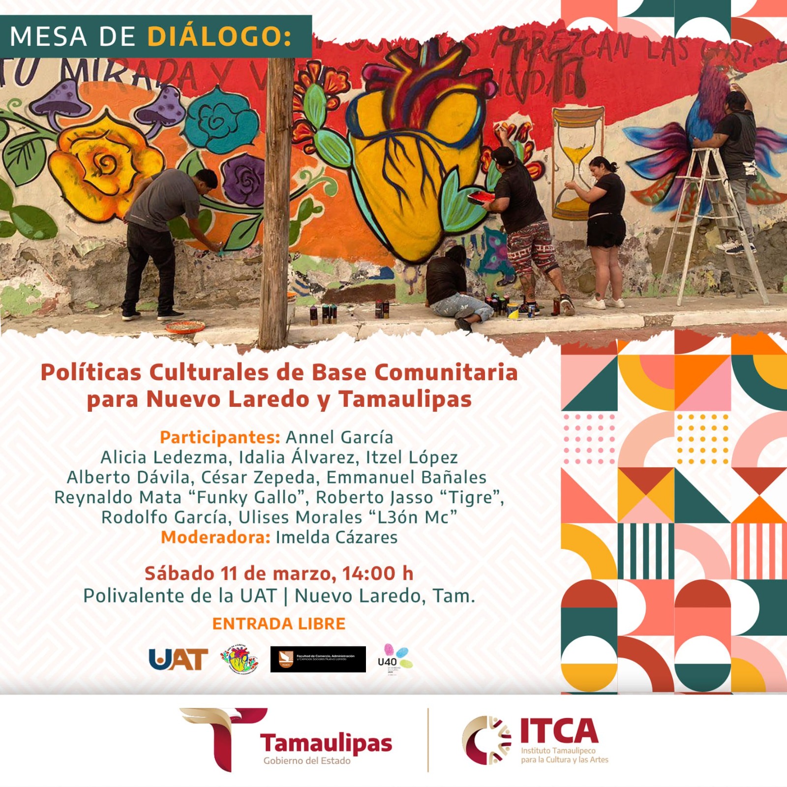 “Los esperamos en esta mesa de diálogo Políticas culturales de base comunitaria para Nuevo Laredo y Tamaulipas, que se realizará este sábado 11 de marzo a las 14 horas en la Sala Polivalente de la Universidad Autónoma de Tamaulipas.