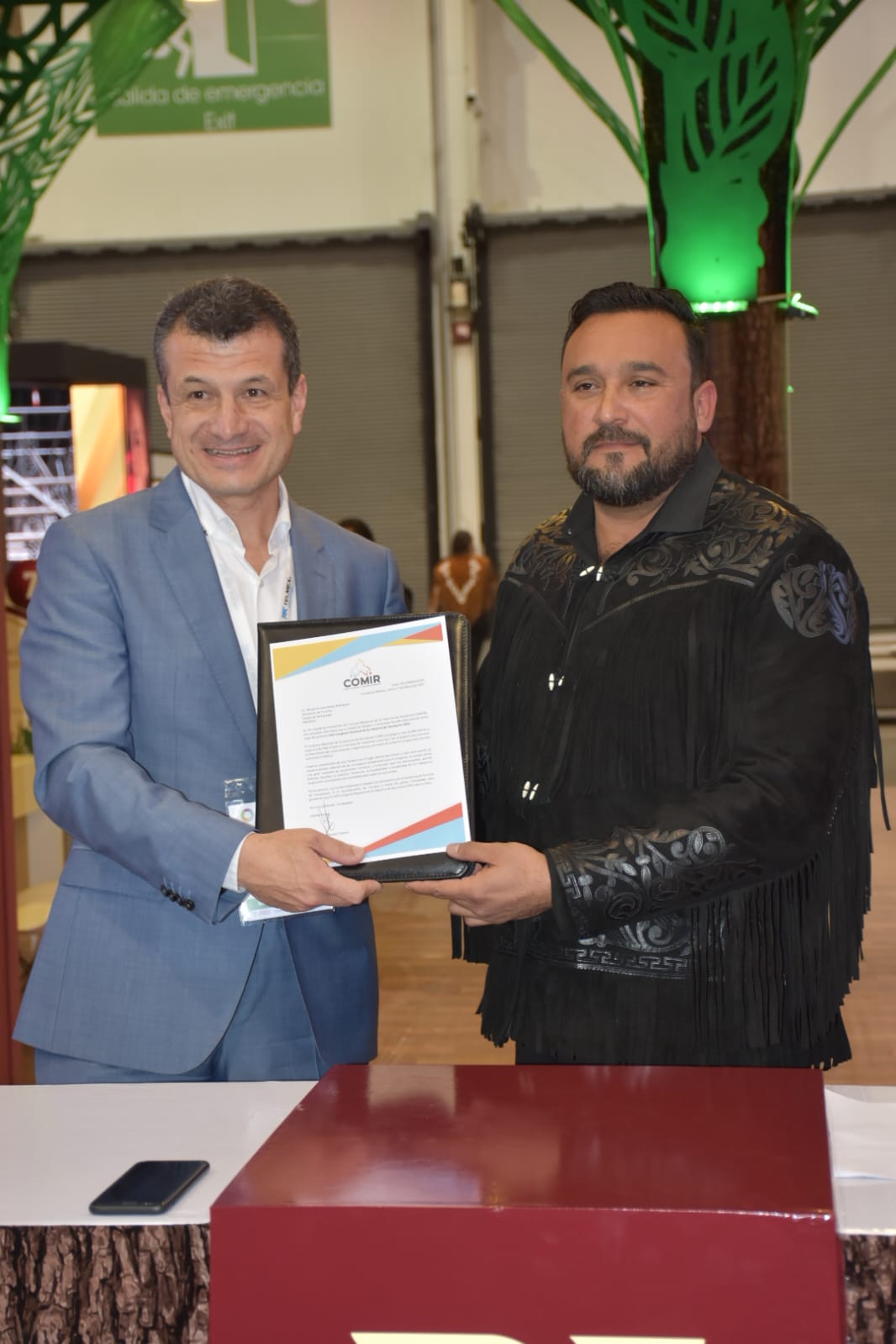Benjamín Hernández Rodríguez, secretario de Turismo en Tamaulipas, recibió en el stand del estado a Alejandro Ramírez Tabche, presidente del Consejo Mexicano de la Industria de Reuniones, en donde se firmó el convenio para realizar este importante evento en Tampico en el año 2025.