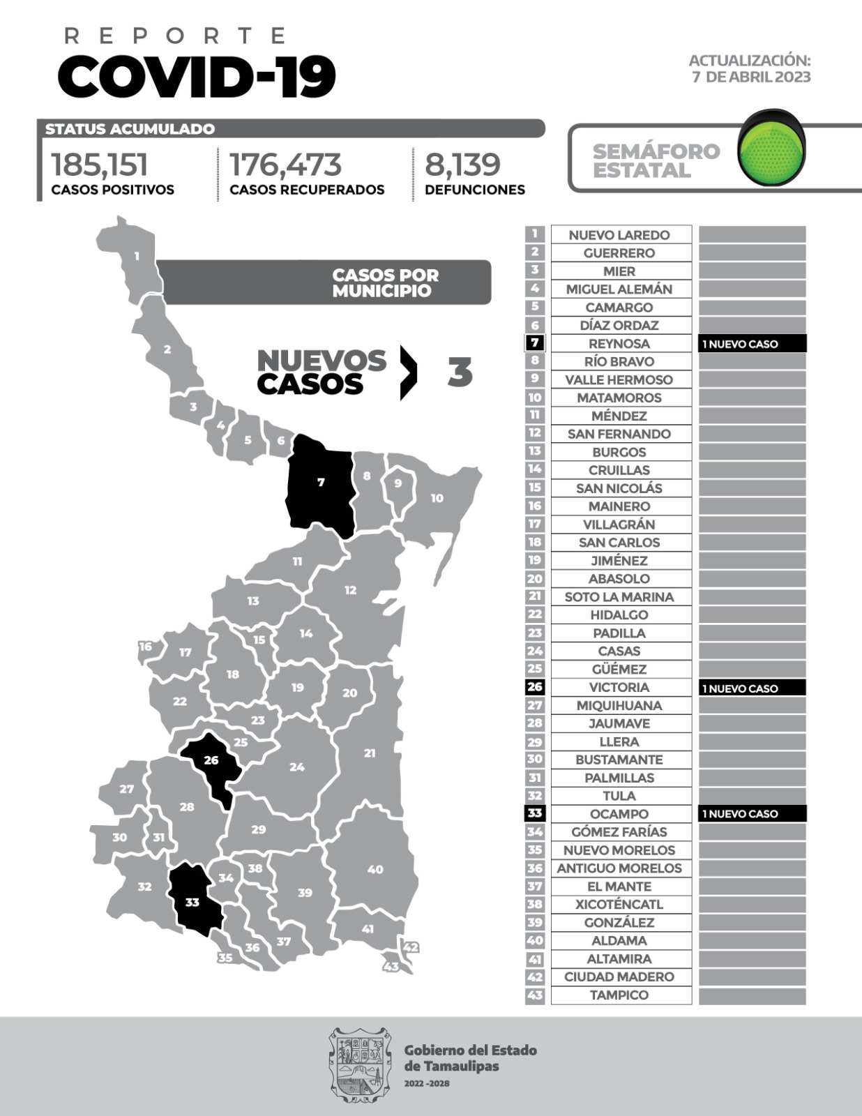 CIUDAD VICTORIA, TAMAULIPAS.- El reporte oficial de casos de COVID-19 de este viernes registra 3 nuevos pacientes y sin fallecimientos.