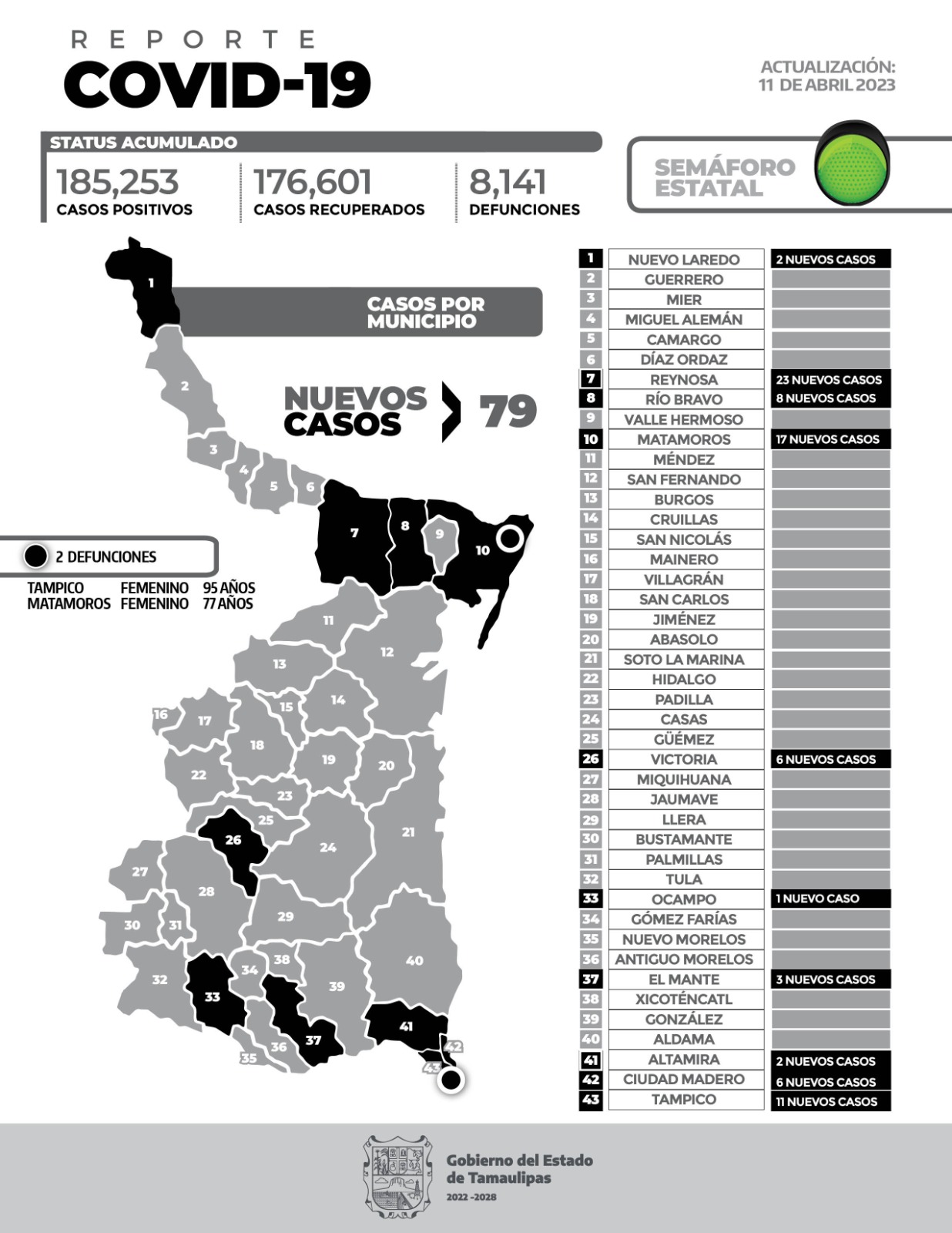 CIUDAD VICTORIA, TAMAULIPAS.- El reporte oficial de casos de COVID-19 de este domingo registra 79 nuevos pacientes y 2 fallecimientos.