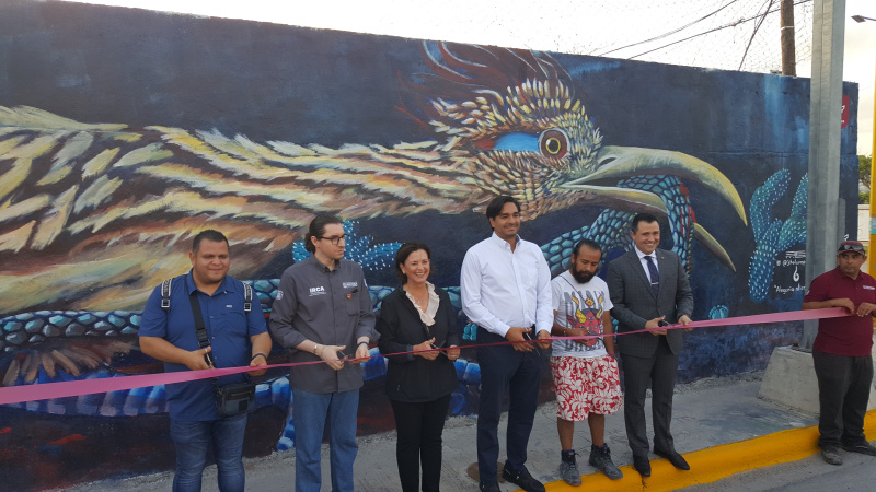 Reynosa, Tamaulipas.-El embellecimiento de la ciudad es una de la prioridad del gobierno municipal de Reynosa, por lo que inauguro el Mural Alegoría al Correcaminos en un concurrido sector popular.
