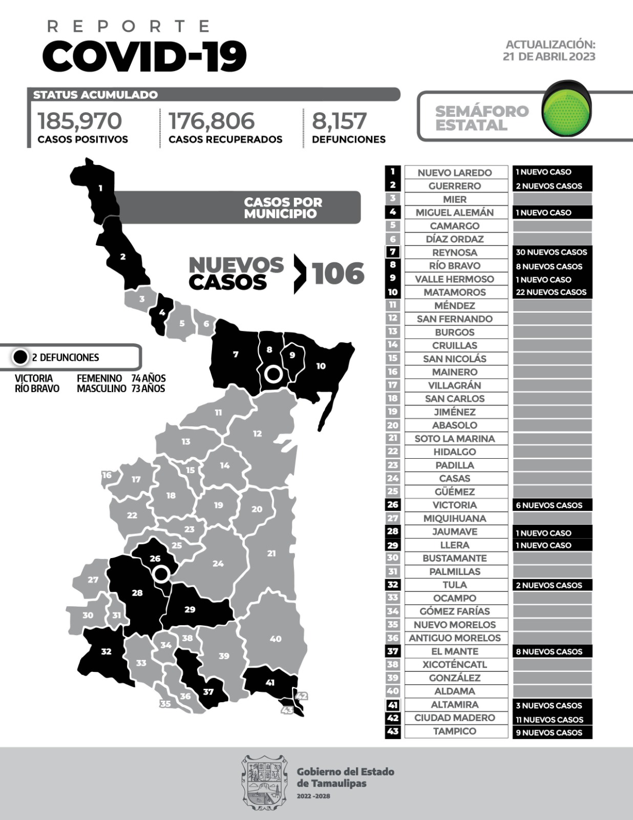 CIUDAD VICTORIA, TAMAULIPAS.-El reporte oficial de casos de COVID-19 de este viernes registra 106 nuevos pacientes y 2 fallecimientos.