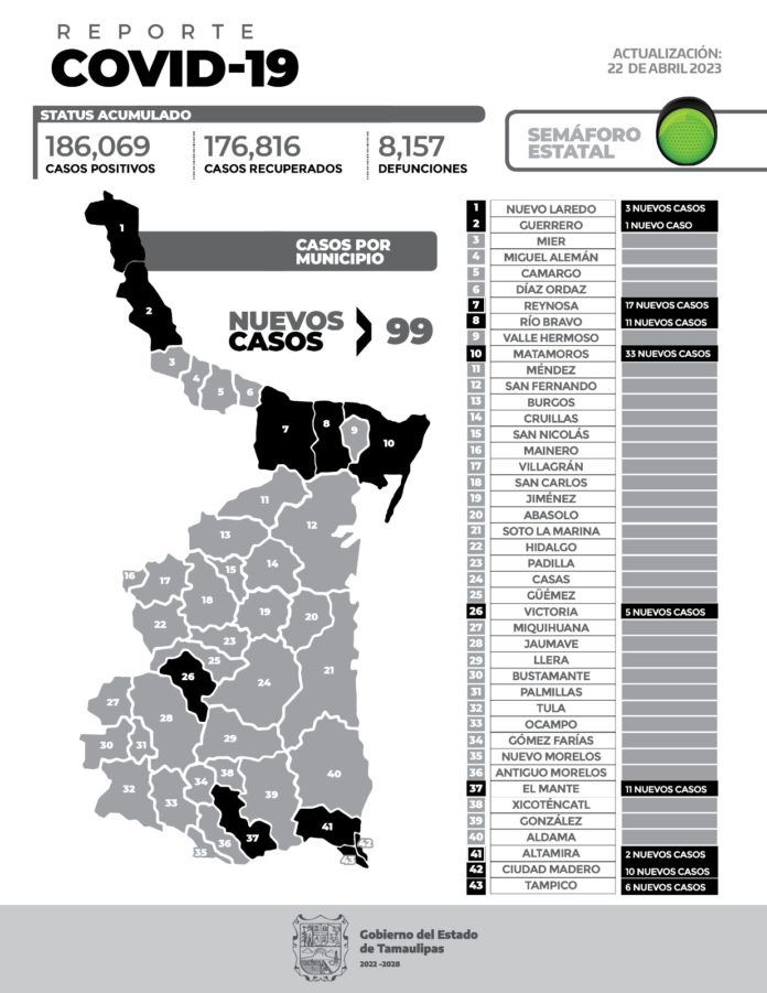 CIUDAD VICTORIA, TAMAULIPAS.- El reporte oficial de casos de COVID-19 de este sábado registra 99 nuevos pacientes y sin fallecimientos.