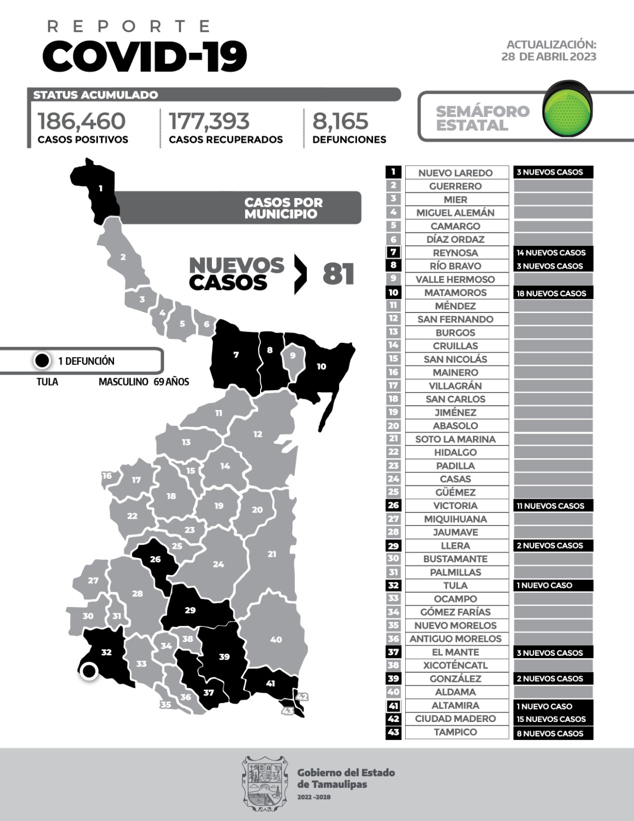 CIUDAD VICTORIA, TAMAULIPAS.-El reporte oficial de casos de COVID-19 de este viernesregistra 81 nuevos pacientes y 1fallecimiento.
