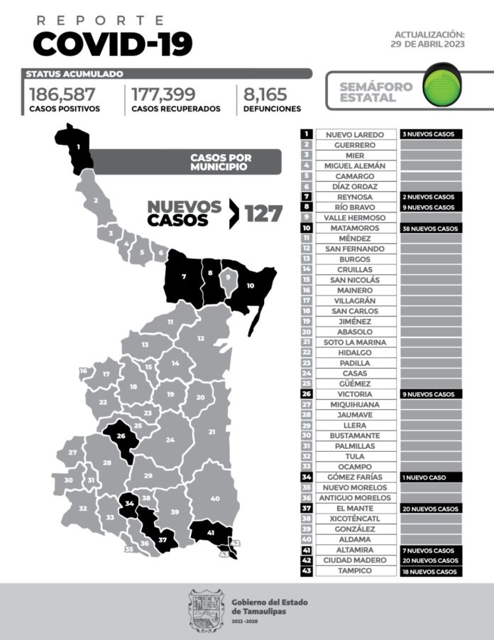 CIUDAD VICTORIA, TAMAULIPAS.- El reporte oficial de casos de COVID-19 de este sábado registra 127 nuevos pacientes y sin fallecimientos.
