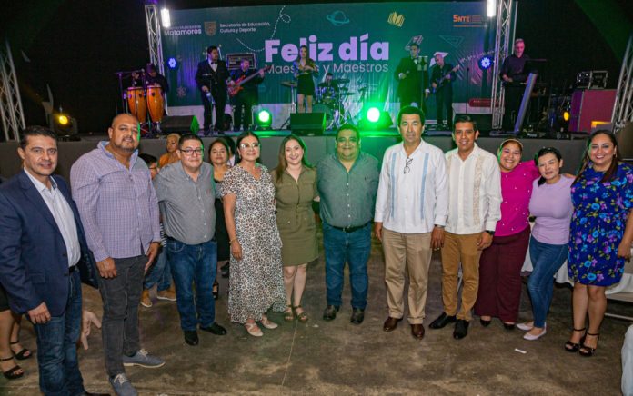 Matamoros, Tamaulipas.-En un ambiente festivo, esta noche el Gobierno de Matamoros que encabeza el alcalde Mario Alberto López Hernández reconoció la labor del magisterio, en un evento en el que participaron más de 5 mil maestros.