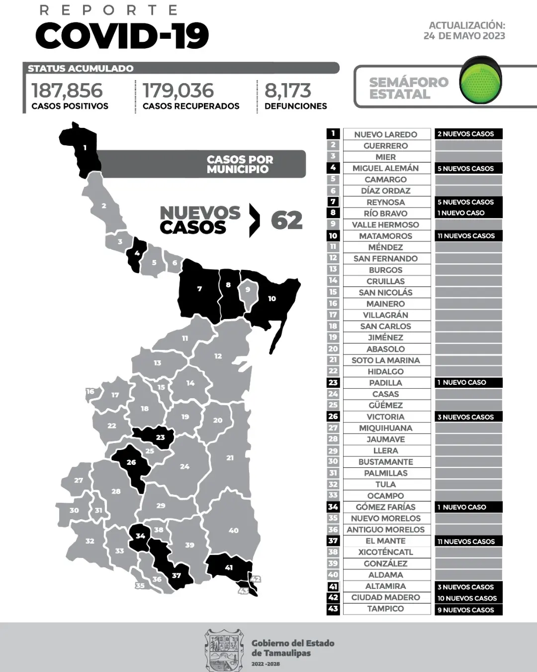 CIUDAD VICTORIA, TAMAULIPAS.-El reporte oficial de casos de COVID-19 de este miércoles registra 62nuevos pacientes y sin fallecimientos.