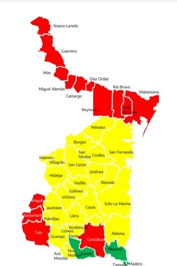 Dentro esta región los municipios de Aldama, Jiménez, San Nicolás, San Carlos y Victoria se mantuvieron en rojo desde abril y mayo, ahora pasan al amarillo.