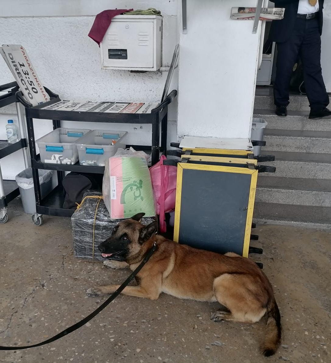 Al realizar la inspección a pie en el área de andenes, “Junior” detectó una sustancia no permitida abandonada por lo que se esperó a la propietaria del paquete.