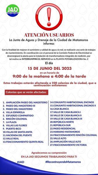 “Debido a trabajados que estarán realizando en coordinación la Comisión Federal de Electricidad y la Junta de Aguas y Drenaje de la Ciudad de Matamoros, este jueves 15 de Junio se desenergizará la Planta Potabilizadora número 2.
