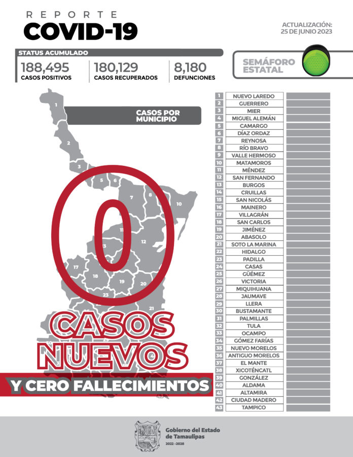 Desde el inicio de la pandemia Tamaulipas registra 188 mil 495 pacientes y 8 mil 180 fallecimientos.