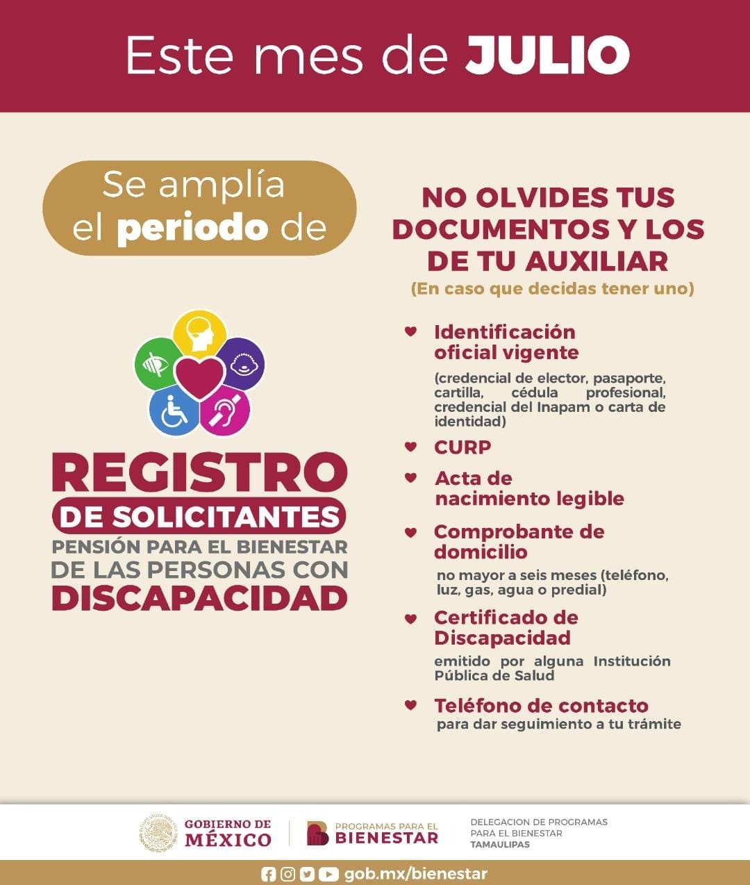 La finalidad de ampliar el periodo de registro durante todo el mes de julio es lograr la mayor cobertura de atención en el Estado: que ninguna persona con discapacidad permanente se quede sin este beneficio.