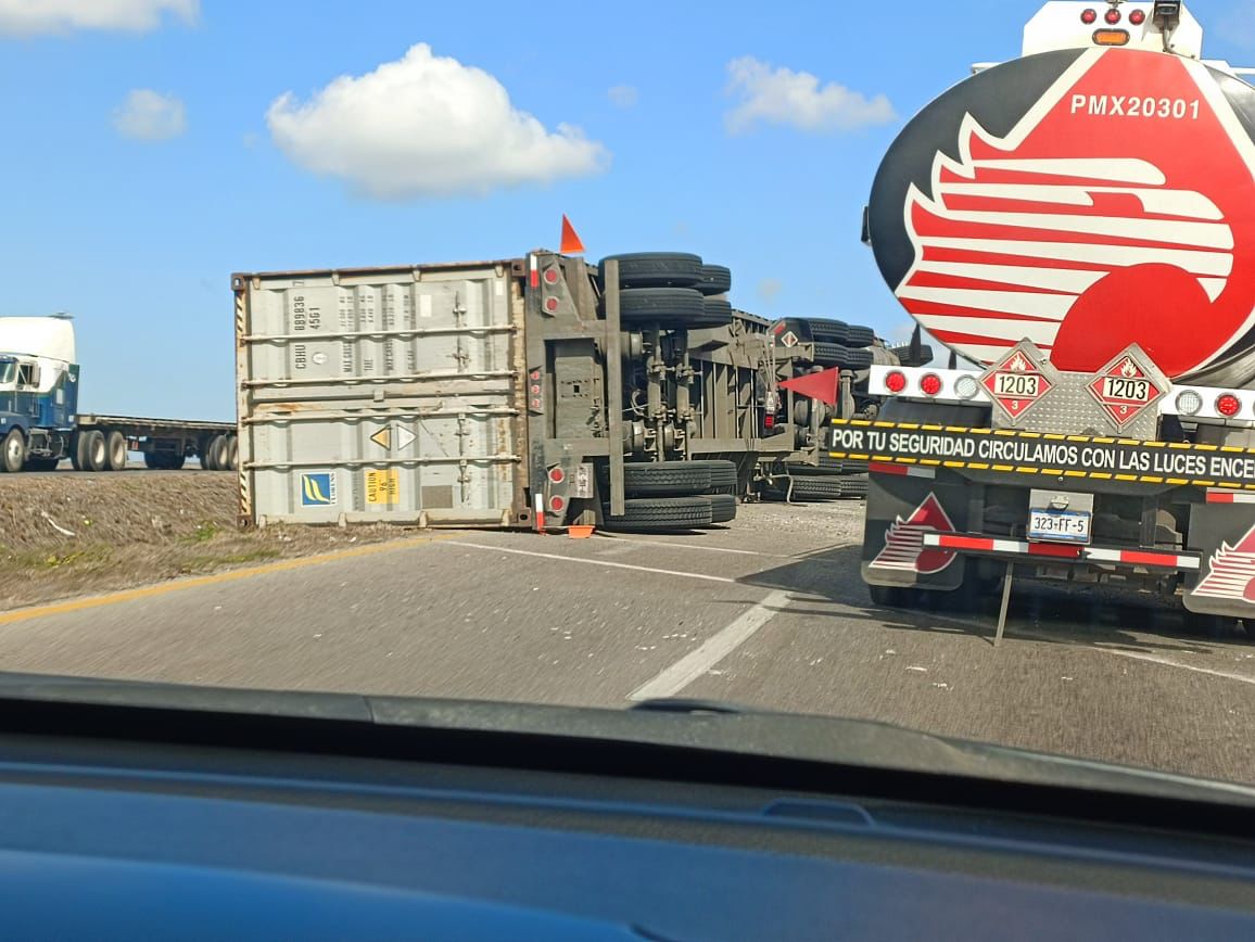 Altamira, Tamaulipas.-Durante la mañana de este miércoles se registró un aparatosa volcadura en la zona industrial de Altamira se trata de un tráiler que en su contenedor transportaba varias toneladas de fertilizante.