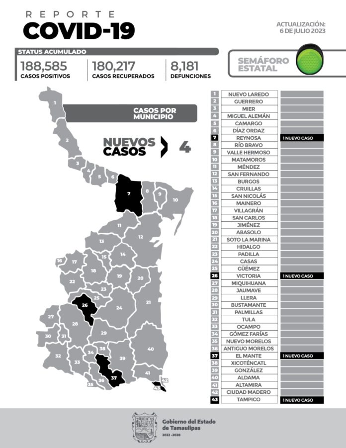 CIUDAD VICTORIA, TAMAULIPAS.–El reporte oficial de casos de COVID-19 de este jueves en la entidad registra 4 nuevos pacientes y sin fallecimientos.
