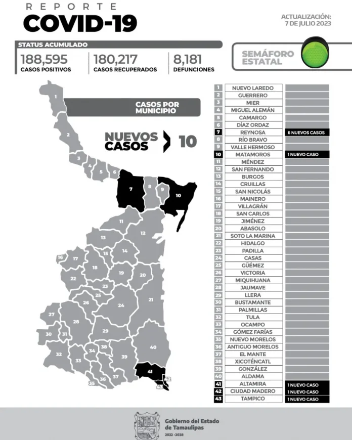 CIUDAD VICTORIA, TAMAULIPAS.–El reporte oficial de casos de COVID-19 de este viernes en la entidad registra 10nuevos pacientes y sin fallecimientos.