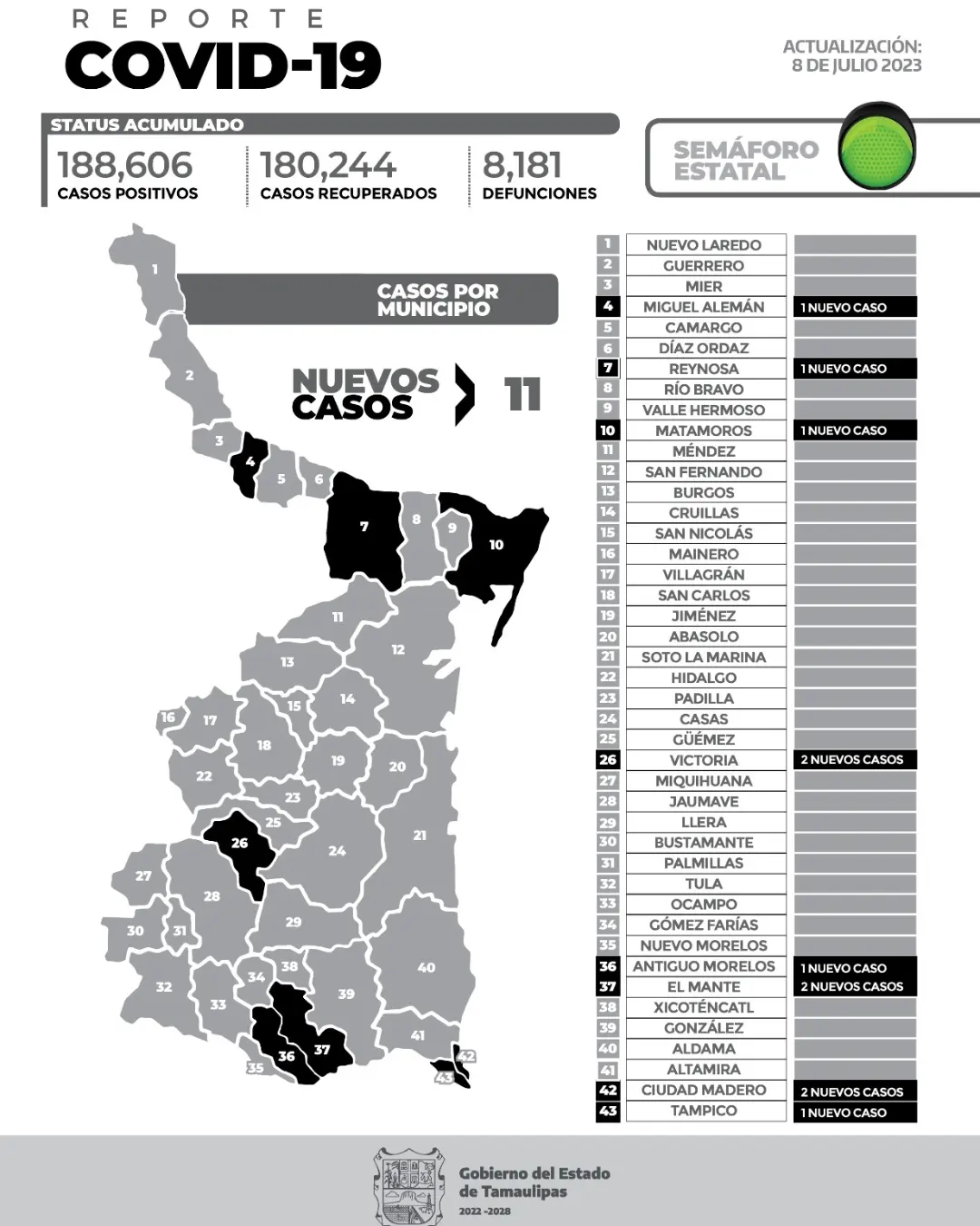 Desde el inicio de la pandemia Tamaulipas suma 188 mil 606 pacientes y 8 mil 181 defunciones.