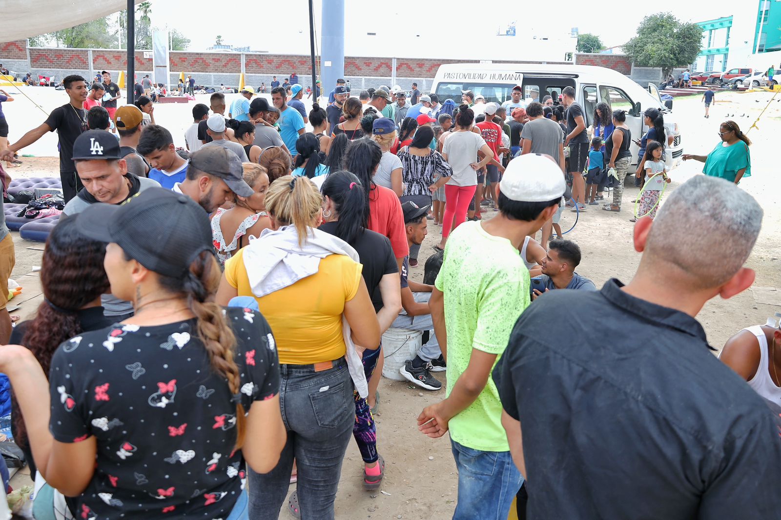 Migrantes reciben la visita del Obispo en improvisado campamento