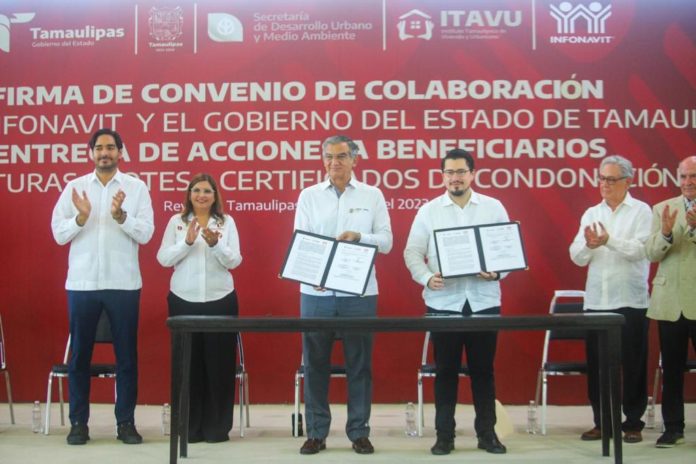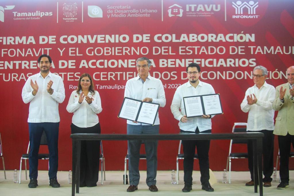 La Firma del Convenio por parte del Gobierno Estatal fue impresa por el Doctor Américo Villarreal Anaya y el Lic. Carlos Martínez Velázquez por parte del Instituto del Fondo Nacional para la Vivienda de los Trabajadores, INFONAVIT, este miércoles 12 de julio.