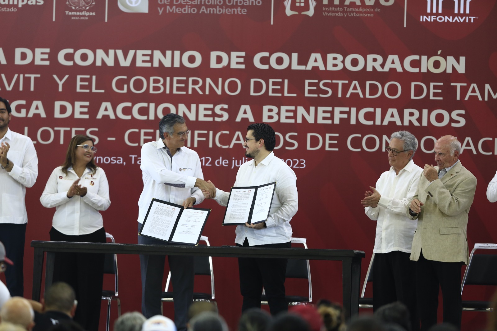 Durante el evento de entrega de acciones a beneficiarios, escrituras, lotes y certificados de condonación, celebrado en la Unidad Deportiva de Reynosa, el gobernador Américo Villarreal Anaya aseguró que es un día de fiesta, ya que muchas familias esperaron durante años este momento para poder tener certidumbre en la propiedad de su hogar y con sus escrituras en propia mano.