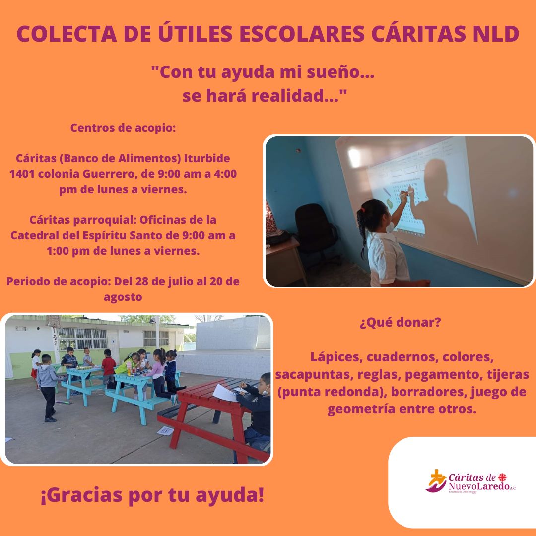 Nuevo Laredo, Tamaulipas.-En la víspera del inicio de clases del ciclo 2023-2024 Cáritas de Nuevo Laredo realizará el 28 de agosto un evento relacionado con la colecta de útiles escolares durante el período vacacional, con la finalidad de apoyar a los niños y adolescentes de escasos recursos económicos en sus estudios, y para ayudar a su economía familiar.