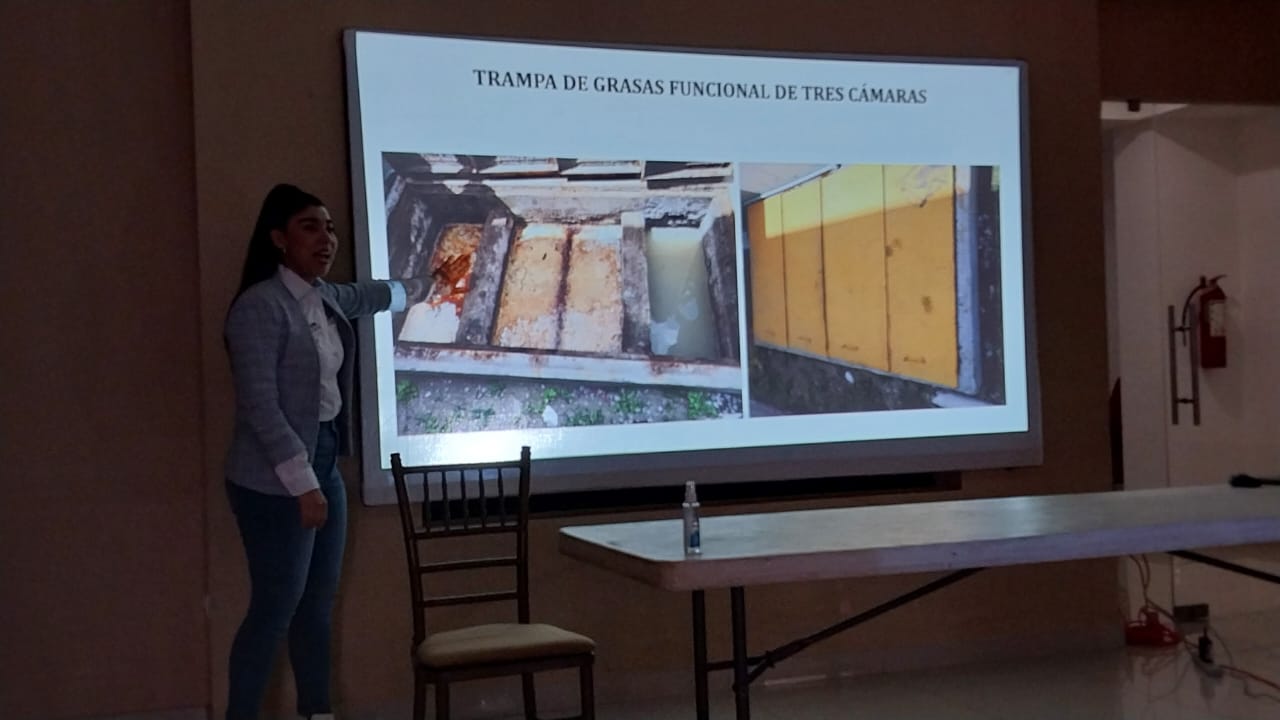 La ponencia estuvo a cargo del Gerente General, Alfonso Gómez Monroy y la Coordinadora de Calidad del organismo, Priscila Leija, quienes abordaron la importancia de que los comercios dedicados al sector gastronómico cuenten con trampas de grasa y darles el mantenimiento constante necesario, para que los desechos eviten llegar al sistema de drenaje.